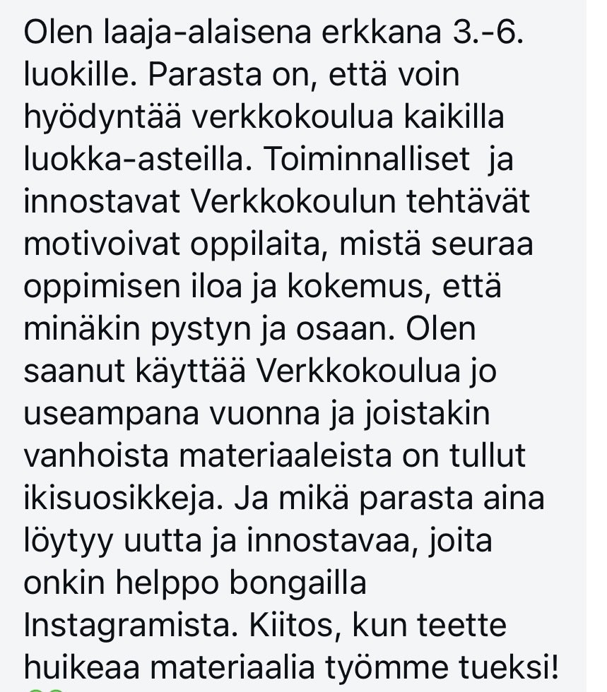 Verkkokoulu on kiireisen opettajan arjen pelastus. Kansiot ovat täynnä valmiita ideoita ja tehtäviä esiopetukseen, 1.–5. luokille, S2-opetukseen ja kielten opetukseen. Erityisopettajat ovat kiittäneet materiaalin monipuolisuutta ja soveltuvuutta erilaisten oppijoiden tarpeisiin. Verkkokoulun tehtävien avulla opetus on helppo eriyttää joko alas- tai ylöspäin – kaikki samasta materiaalista. Esiopetuksen osuus on erityisen laaja, ja luokkien 1–4 materiaaleilla voi toteuttaa myös oppikirjattoman opetuksen. Ideoita löytyy runsaasti myös ulkona toteutettavaan opetukseen.